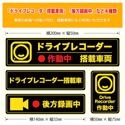 商品詳細 ▼商品名 後方録画中 ステッカー シール 4種セット ドライブレコーダー搭載車両 あおり運転 嫌がらせ運転対策 ブラック 高品質 日本製 ▼商品説明 簡単にできる安全運転対策!貼るだけで、嫌がらせの接近や悪質な幅寄せ、追突事故を抑止する効果があります。