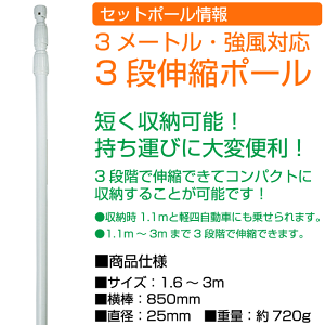 ■のぼり旗 フライドチキン 内容:フライドチキン [受注生産] (SNB-661) の商品スペック ●表示内容 : フライドチキン ●素材 : ポリエステル製 ●サイズ : W600×H1800mm ■【セット品】3段伸縮ポール(白) (846) スペック表 ●サイズ:1.1〜3メートル ●横棒(かんざし)長さ:850mm ●ポール太さ:Φ25mm(強風に強い太め仕様) ●適用のぼり旗サイズ:600×1800mm(もっとも一般的な寸法) ●重量:約720g ●材質: ターンキャップ:ABS樹脂・PP ジョイント部:ABS樹脂 下キャップ:PP 横棒:FRP・PP パイプ部:スチール(鉄)パイプに樹脂コーティング・PP※本のぼり旗は受注生産品になります。